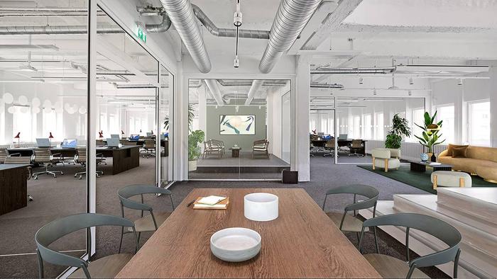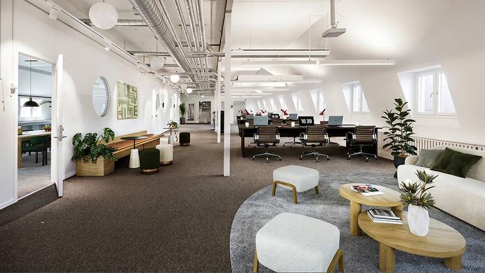 Planlösning:Lokalen är fördelad på två våningsplan med kontorsrum, mötesrum, lounge, fokusytor, pentry och WC. Trappor ger god tillgänglighet mellan våningsplanen och stödjer en flexibel arbetsmiljö.