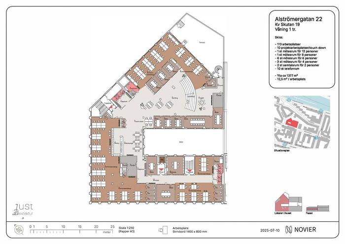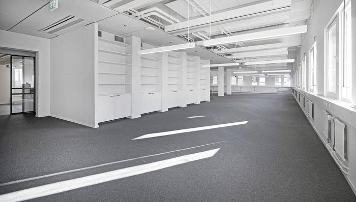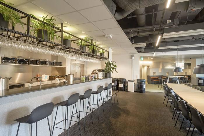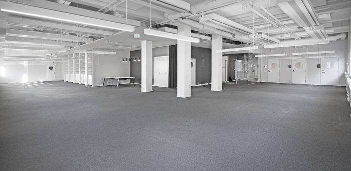 Lokalen erbjuder ett stort, socialt pentry med matplats, flera mötesrum och tysta telefonrum, samt en rymlig samlingsyta med gradäng som är perfekt för interna presentationer, workshops eller gemensamma möten.
