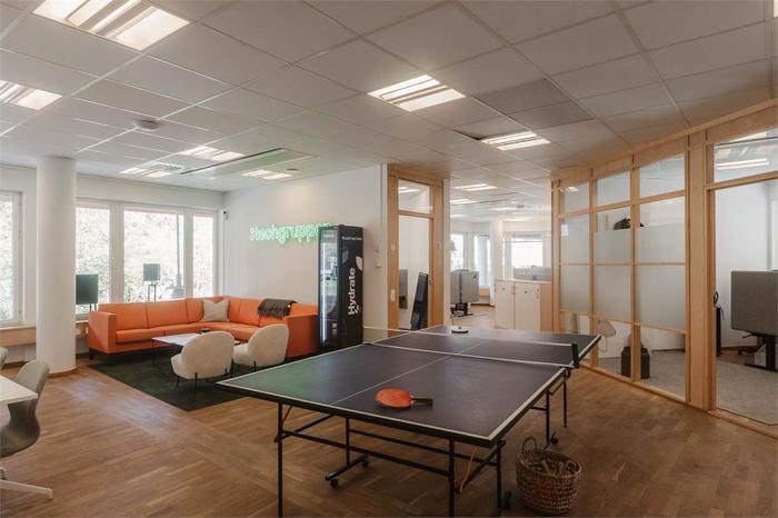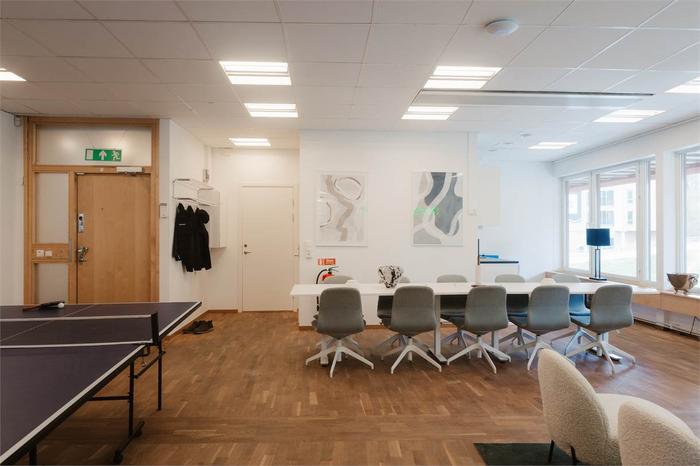 Lounge med pentry och matplatser, ett kontorsrum, ett konferensrum samt kontorsyta i öppet landskap.