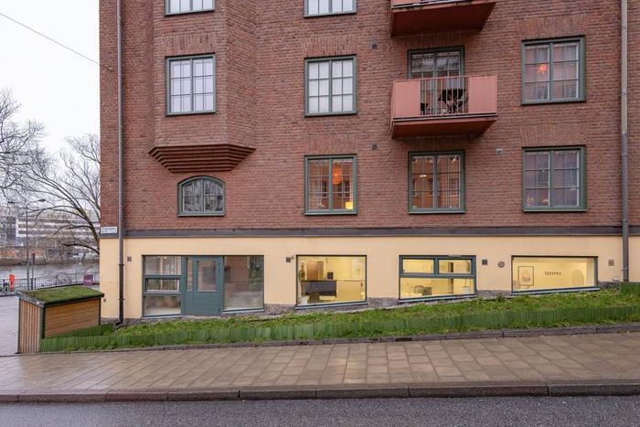 Lokalen präglas av stora fönster längs fasaden och ett generöst skyltfönster mot vattnet som ger en fantastisk utsikt och ett otroligt ljusinsläpp. Det är sällan man hittar en lokal med en sådan närhet till vattnet, här får hela området och strandlinjen ett eget uttryck i lokalen.