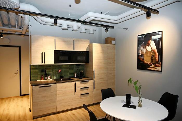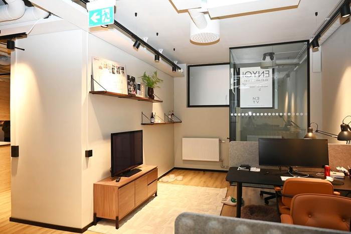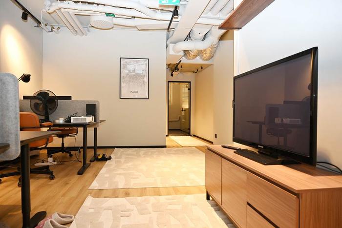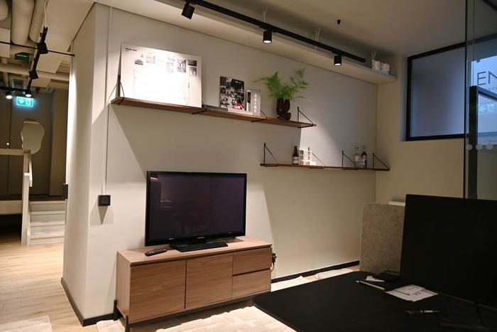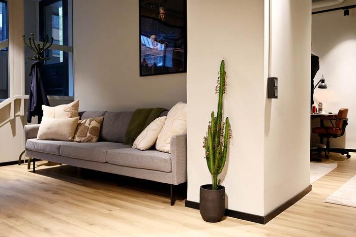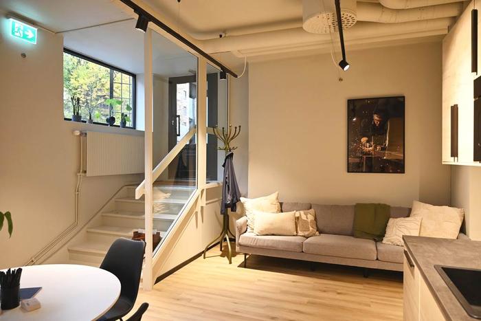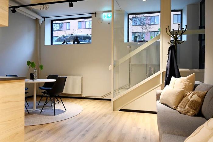 Egen entré från gatan och därefter några trappsteg ner till ett trevligt välkomnande pentry med pausarea och plats för en loungedel. Längre in i lokalen finns ett öppet landskap för upp till ca 8 arbetsplatser samt ett teamsrum för 1-2 pers och ett mötesrum för ca 4 pers. Utöver detta finns 1 st WC, 1 st RWC med dusch samt 1 st städskrubb med utslagsvask.