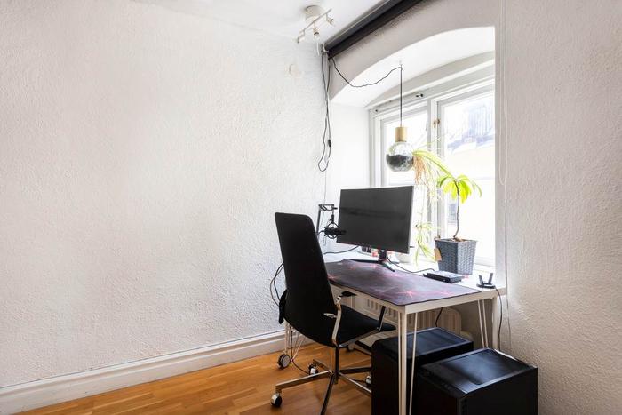 Lokalen är belägen på tredje våningen i huset, och nås bekvämt via hiss. Kontorsytan är fördelad över två separata rum med fönster i två väderstreck, vilket ger ett generöst ljusinsläpp. Centralt i lokalen finns ett trivsamt kök som fungerar som en naturlig samlingspunkt. De frilagda takbjälkarna ger karaktär och atmosfär med tydlig förankring i Gamla Stans unika miljö. Här finns även ett öppningsbart fönster med infälld sittbänk, perfekt för stunder av återhämtning. Kontoret har även en bekväm wc med både bad och dusch.