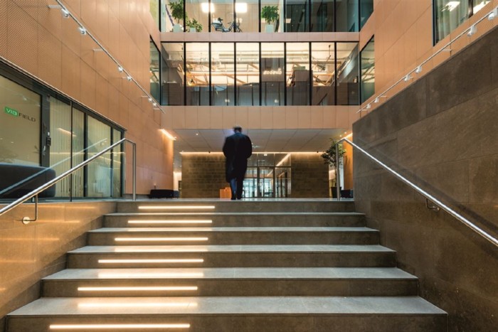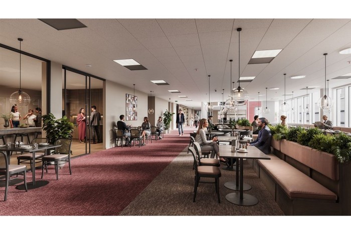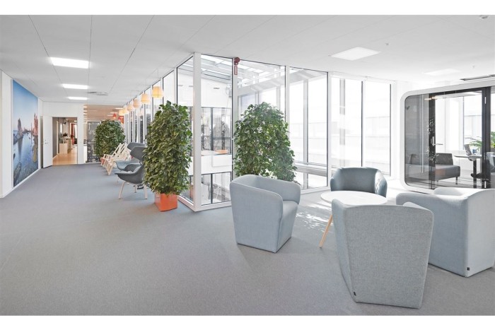 Välkomnande, representativ entré längs Evenemangsgatan med rymd och takhöjd som imponerar, här finns gott om loungeyta.