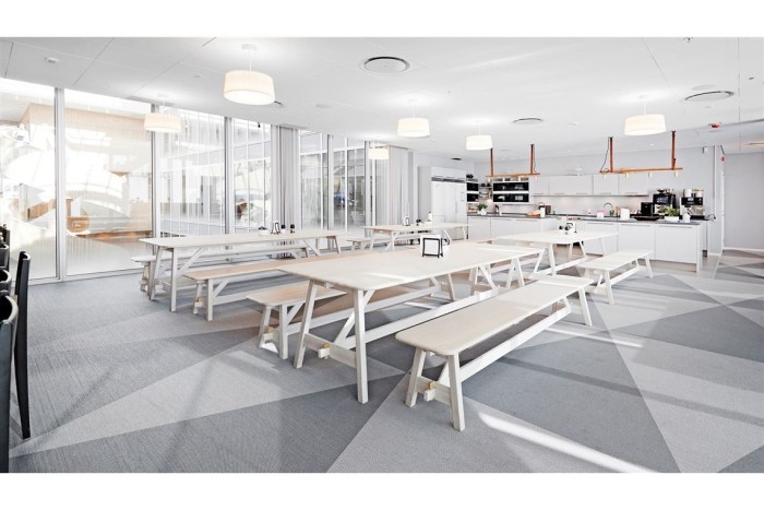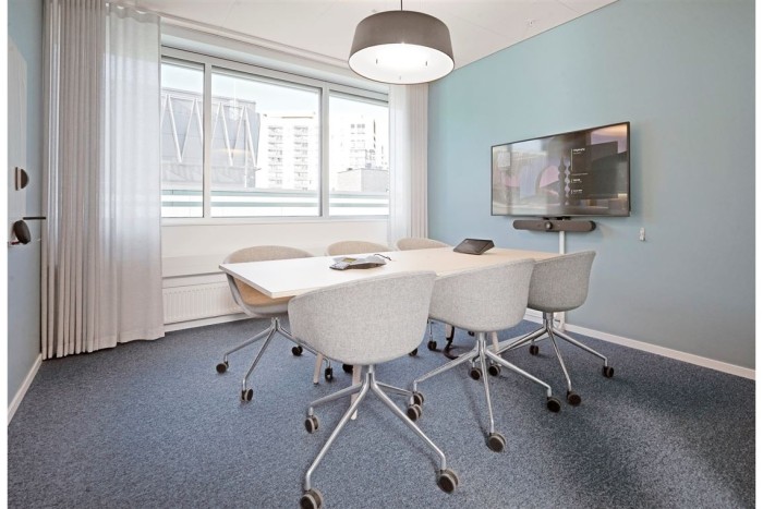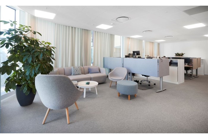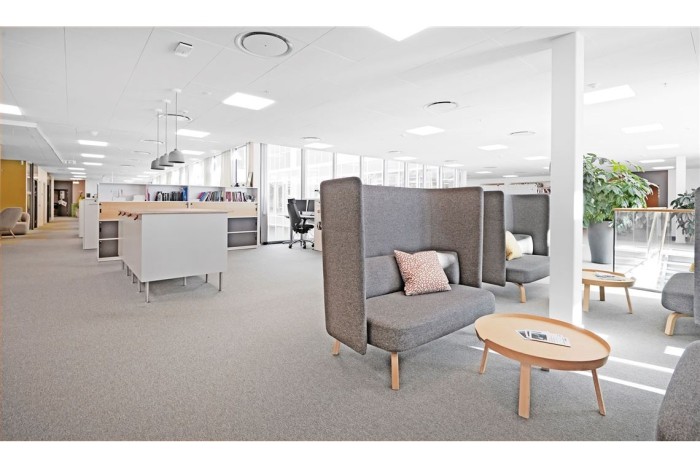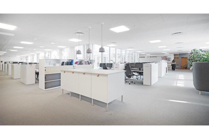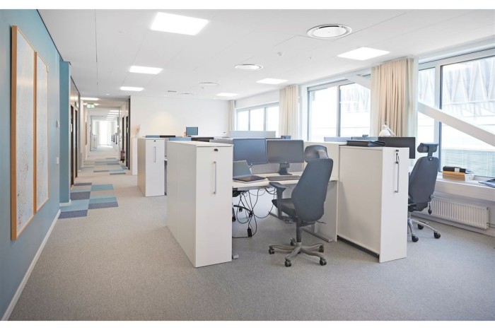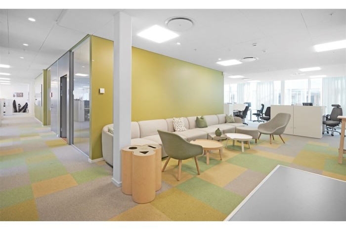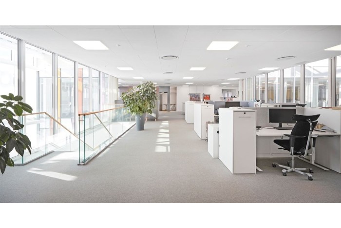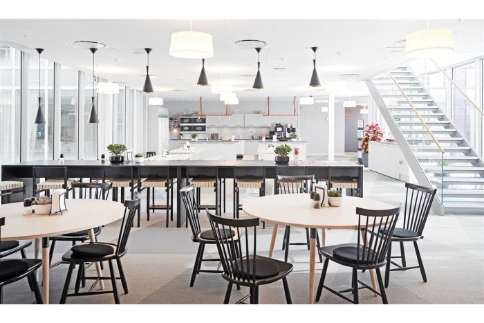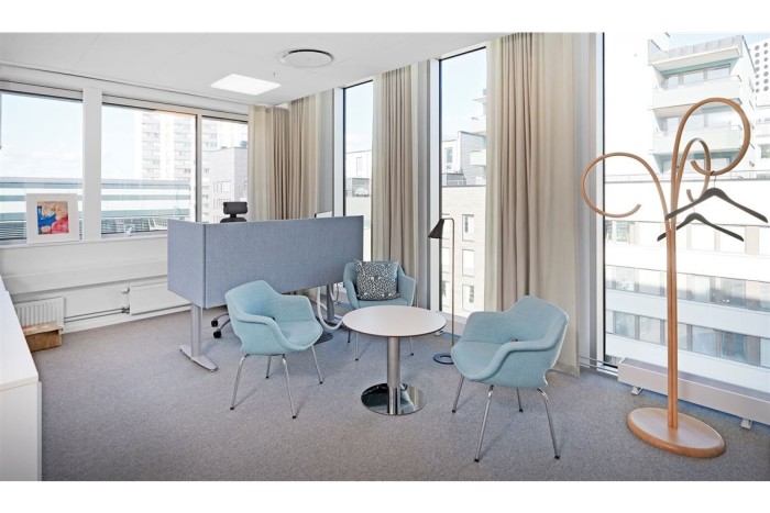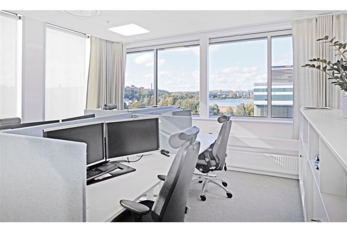 Denna kontorslokal har fönster från golv till tak och ljusa, fräscha ytskikt. Vy över pulserande Evenemangsgatan på ena sidan och grönskande Råstasjön på andra. Gott om sällskapsytor ger möjlighet för anställda att umgås.