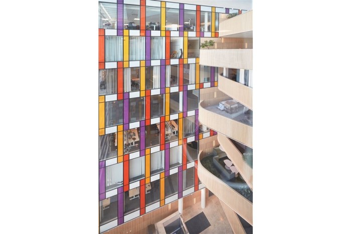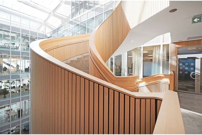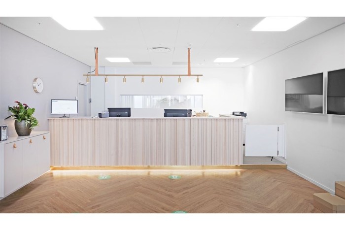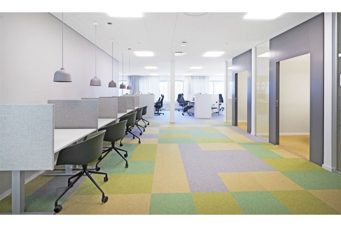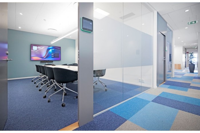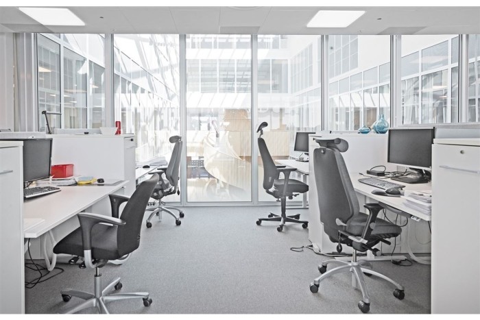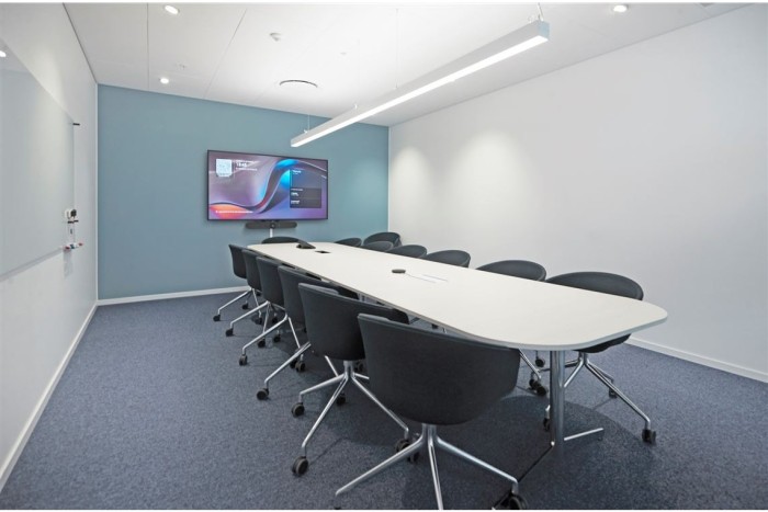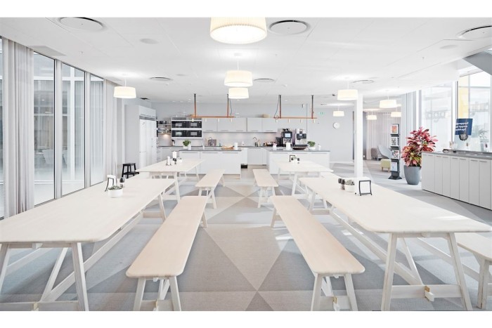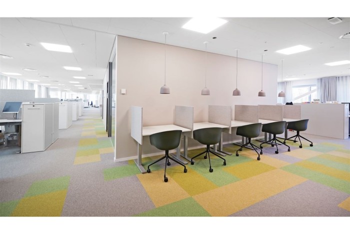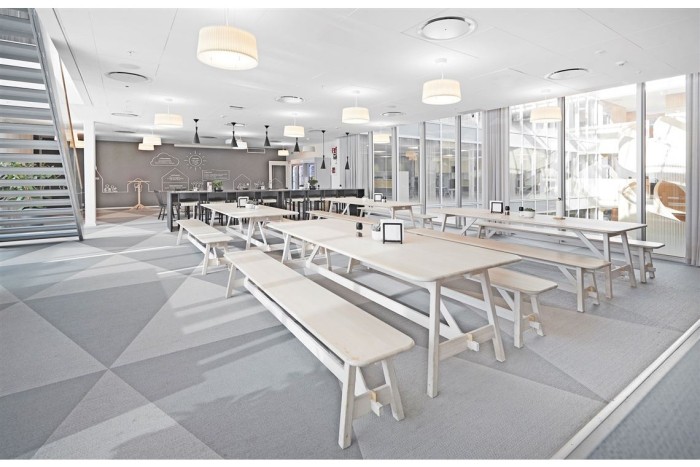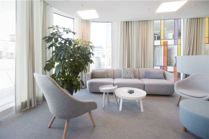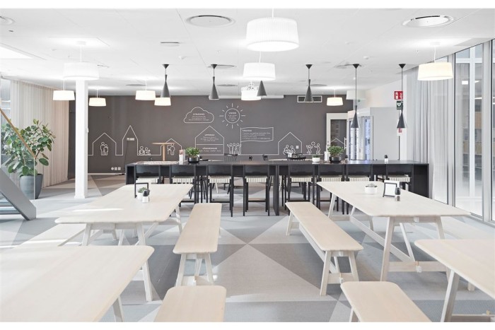 Denna kontorslokal har fönster från golv till tak och ljusa, fräscha ytskikt. Vy över pulserande Evenemangsgatan på ena sidan och grönskande Råstasjön på andra. Gott om sällskapsytor ger möjlighet för anställda att umgås.