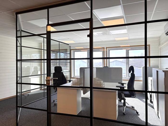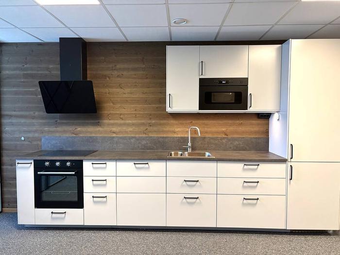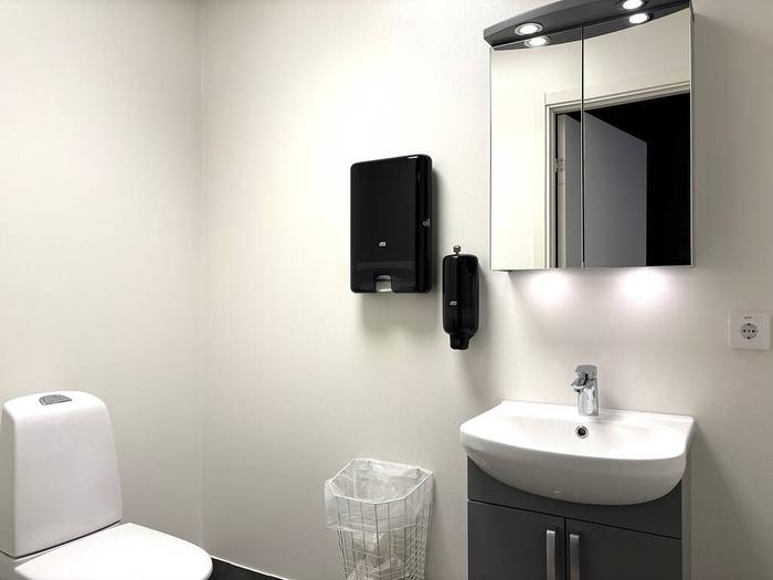 Övre plan har en mycket elegant och påkostad inredning med kontorsrum där väggarna är av glas med svart stålkonstruktion, innertak med inbyggd ventilation och påkostad belysning, ett snyggt innergolv i form av en gråsvart filtmatta och innerväggar med mörkbetsad träpanel. Köket är stilfullt med ljusgrå luckor, gråbrun bänkskiva, rostfri diskho, inbyggd micro, integrerad kyl & frys, inductions spishäll, inbyggd varmluftsugn i svart, svart spisfläkt och en integrerad diskmaskin, bra förvaring i ett flertal överskåp och lådsystem. Kontoret har vitmålad träpanel på vägg och gråsvart filtmatta på golvet, stort fönsterparti som ger ett fint naturligt ljusinsläpp, luftvärmepump, 5 el-uttag och 4 uttag för internet. Omklädnings- och duschrummet har ett grått klinkergolv med värme (el) och vitmålade väggar, duschhörnan har ett grått klinkergolv med mindre plattor och stora gråa kakelplattor på vägg, fint innertak med snygg belysning. WC har ett grått klinkergolv med värme (el) och vitmålade väggar, handfat med underskåp i grått, spegel med spotlightsbelysning, svart Tork inredning för tvål, toapapper och handdukar, fint innertak med snygg belysning. Städ och förrådsrum med gråsvart filtmatta på golv och vitmålade väggar.
