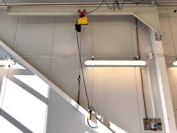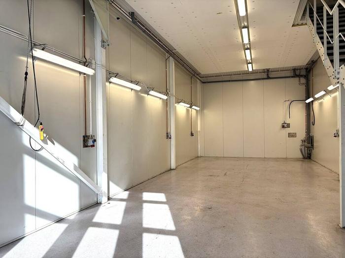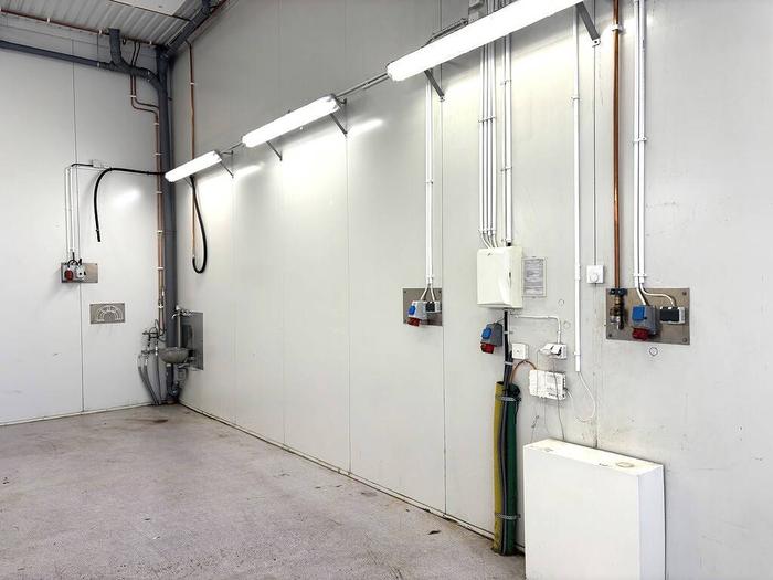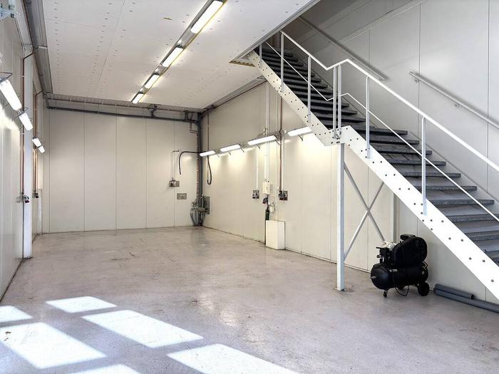 Lokalen mäter ca 196 kvm fördelat över två plan med en bredd på ca 6 m och ett djup på ca 16 m. Entreplanet är försedd med en vikport med måtten B 4,0 H 4,5 m, ett epoxymålat golv med oljeavskiljare, extra installerad belysning i tak och på väggsidorna, tryckluftssystem är installerat med 5 påkopplingsdon utfördelade på innerväggarna - systemet drivs av en kompressor som en köpare själv får ombesörja inköp av, generös takhöjd på ca 5 m där innertaket är ljudisolerat för att förhindra ljud upp till det övre planet, en installerad travers med elmotor - SleinbergSystems SBS-ECH-30, 8 st 3-fas uttag finns uppsatta på olika platser vägg samt 6 vanliga el-uttag, en mindre tvättho i rostfritt, behaglig värme via vattenburet golvvärmesystem (fjärrvärme).