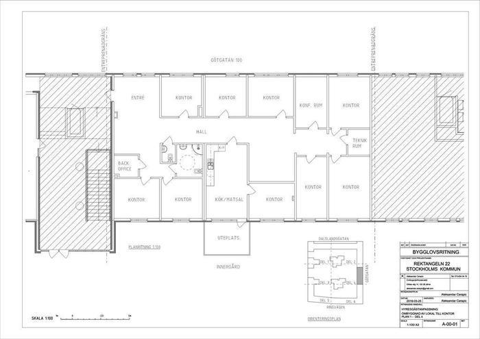 Lokalen har en mycket bra planlösning bestående av ett antal kontorsrum, rymligt kök , två moderna wc och dusch som är handikappanpassade. Man även kan enkelt omvandla lokalen till en mer öppen planlösning. Lokalen har även en egen tillhörande uteplats. Mycket god ventilation.