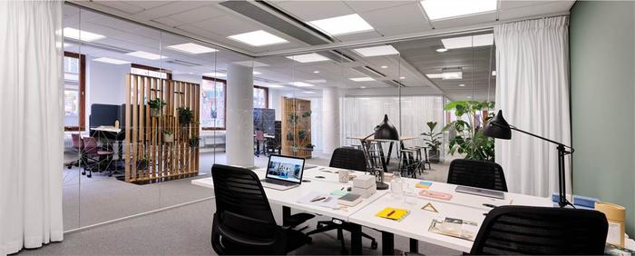 Här kan vi erbjuda arbetsplatser i rum eller öppet kontorslandskap för företag med 1 person upp till 100 anställda!