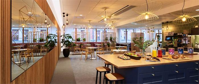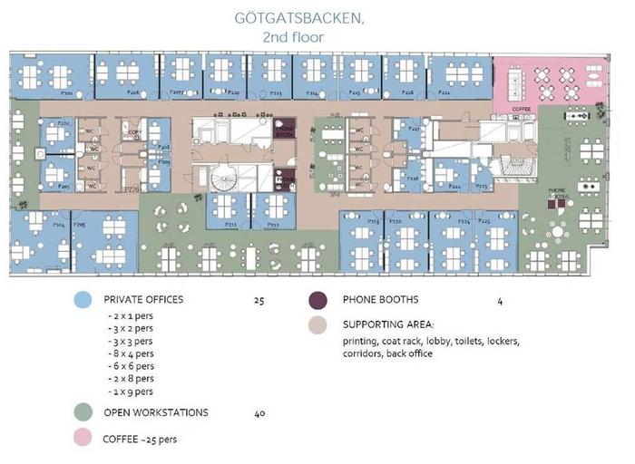 Här erbjuds en aktivitetsbaserad arbetsmiljö i öppet kontorslandskap, privata kontorsrum, tillgång till ljudisolerade telefonbås, bokningsbara konferensrum samt mindre samtalsrum. På varje våningsplan finns moderna pentryn och duschmöjligheter.