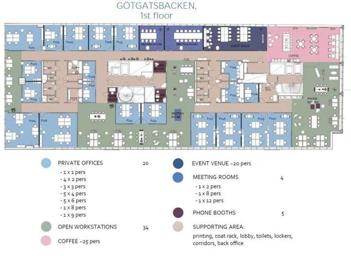Planlösning:Kontorshotell/ Coworking om ca 4-550 m². Centret fördelar sig över två plan på första och andra våningen vilka tillsammans utgör en yta om ca 2700 m².