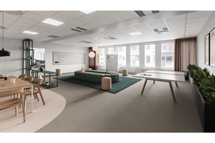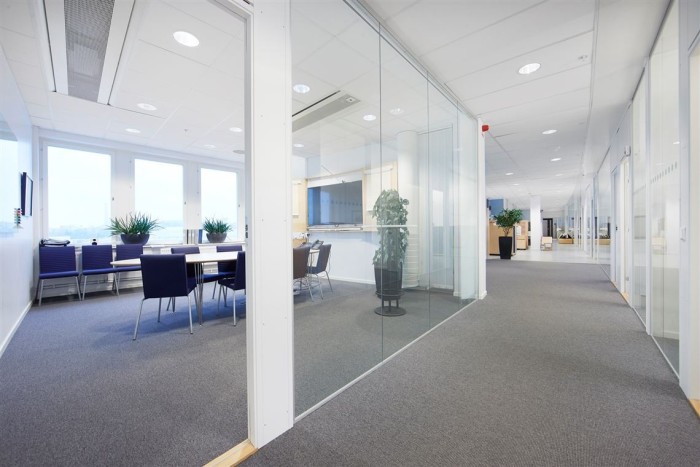 Lokalen är mycket rymlig och har många stora fönsterpartier. I dagsläget är planlösningen utformad med glasade kontorsrum, tre stora konferensrum, flertalet mötesrum, pausdel, pentry, förråd samt flertalet WC och dusch. Lokalen har två entréer vilket möjliggör en extern och en intern del.