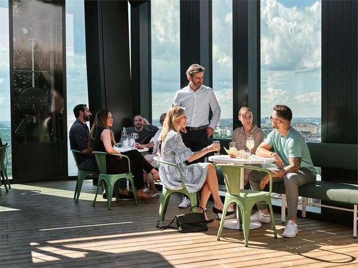 Kontoret på våning 12 är inflyttningsklart och inrett med ljusa, stilrena färger och material i samarbete med Sauerbruch Hutton och BAU. Lokalen har en otrolig utsikt och ett fantastiskt ljusinsläpp genom fönsterpartier som löper från golv till tak. Den är designad för social samvaro med många öppna ytor som ger möjlighet till kreativt samarbeta, samtidigt som de mindre rummen ger plats för fokuserat egenarbete. Lokalen är tillgänglig omgående och det finns självklart möjlighet att göra anpassningar utifrån er verksamhet och era behov.
