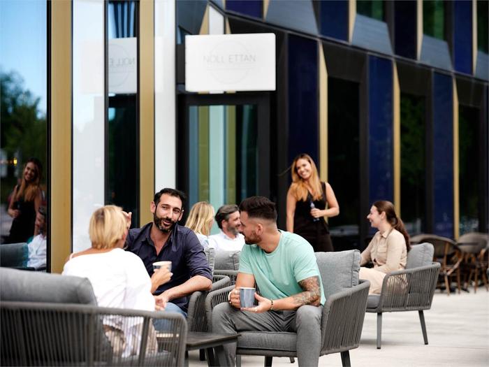 Sjöstaden Skybar, en restaurang med takterrass som drivs av krögaren Niklas Ahlbom. Dessutom finns Café NollEttan och Tastory. I entréplan finns coworking-möjligheter och extra stora mötesrum kan hyras hos Spaces.