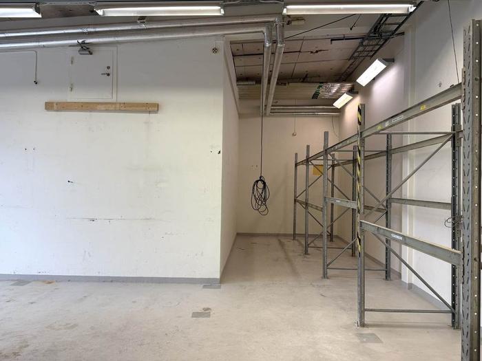 Lagerdelen har en generös takhöjd och direktaccess via port, vilket ger smidig in- och utlastning. (Observera att golvbrunn ej finns i lokalen.)