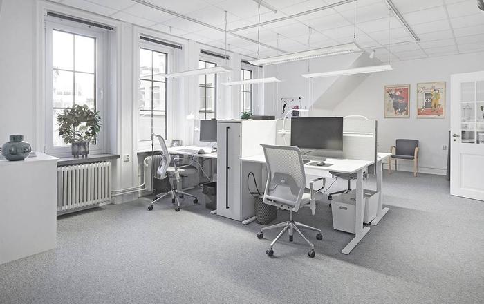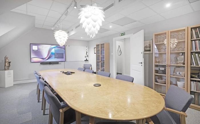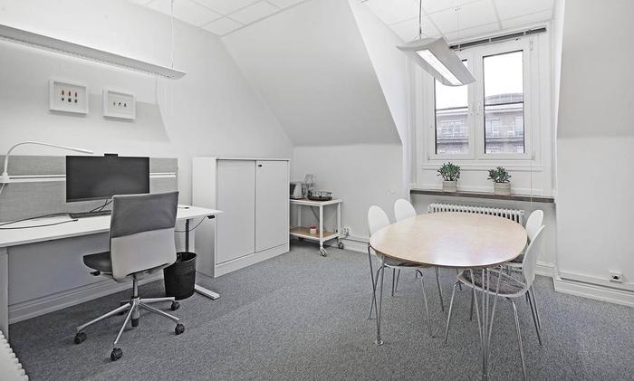 Planlösning:Vid entrén möts man av en praktisk avhängningsdel, ett representativt konferensrum för åtta personer samt en WC. Längre in i lokalen finns ett pentry och ett pausutrymme som övergår i kontorsplatser och ett internt mötesrum.
