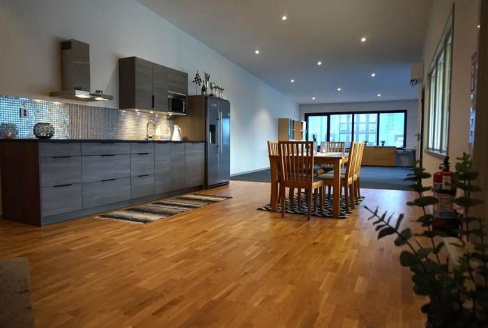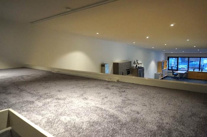 Övre plan är en utmärkt yta för showroom, kontorsyta, lunchrum och allmänt personalutrymme. På detta våningsplan har man ett snyggt ekparkettgolv samt en mörk filtmatta på del av våningsplanet, uppbyggda innerväggar som är vitmålade med grå lister och foder som ger ett stilfullt intryck, innertak med infälld spotlightsbelysning. Här har man inrett med kontorsyta för 6-8 personer, badrum, kök, entresolplan/loft för förvaring, skrivar- /arkivrum och gemensamhetsytor för personalen. Trappen upp från nedre plan är inbyggt och en hall är inredd med hatthylla och plats för ytterkläder och skor. Det stora rummet är ljust och fint då det har ett flertal fönster i väst för naturligt ljusinsläpp. Ett oerhört stilfullt kök med köksluckor i grått med fin förvaring i väggskåp och lådsystem, svart laminatbänkskiva, silvermosaik på vägg ovan bänkskiva, rostfri fläkt, nedfälld spishäll, integrerad diskmaskin, microugn, kyl & frys i rostfritt, spotlightsbelysning under väggskåp, svart diskho, matplats för 8-16 personer. Badrummet har ett grått klinkergolv och helkaklade väggar i vitt, handfat med underskåp, duschhörna med glasdörrar, spegel med belysning och spotlightsbelysning i tak.