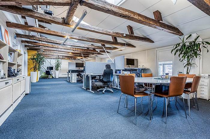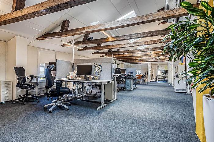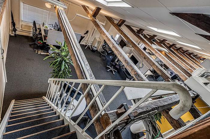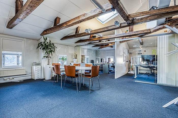 Planlösningen har en bra mix av rum i varierande storlek och ett öppet kontorslandskap med härlig rymd, snedtak, takfönster och synliga takbjälkar!