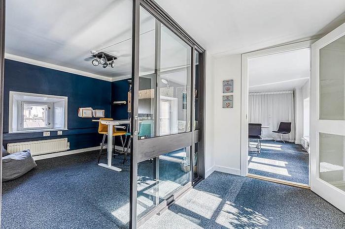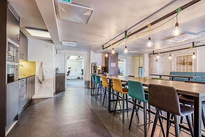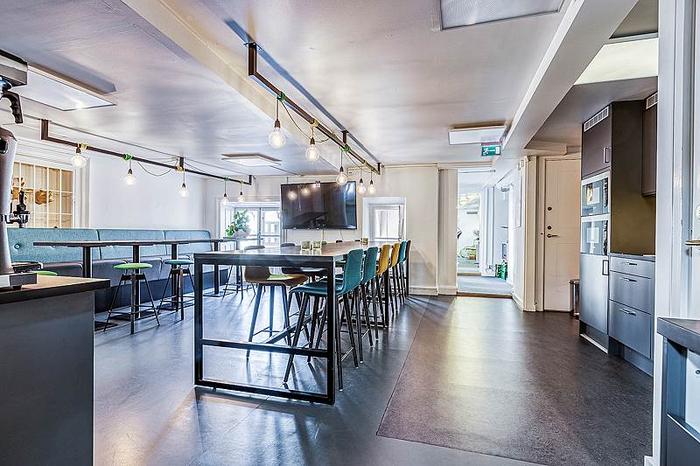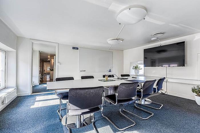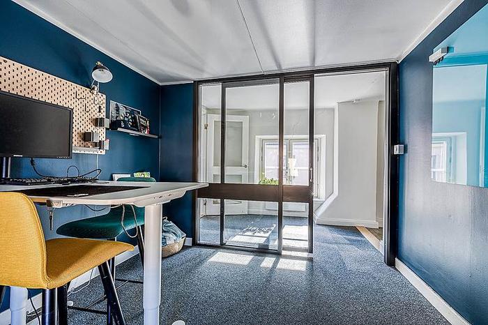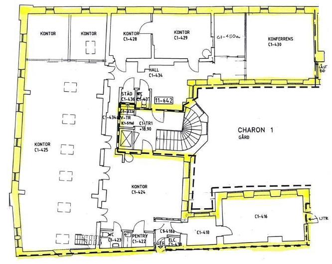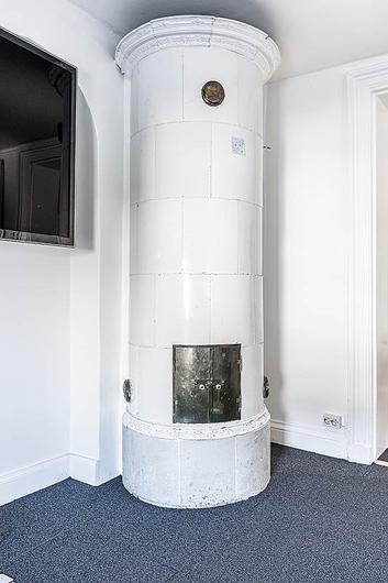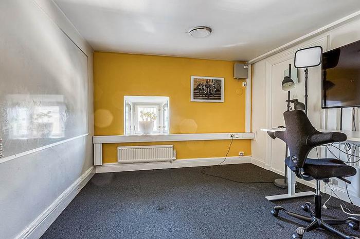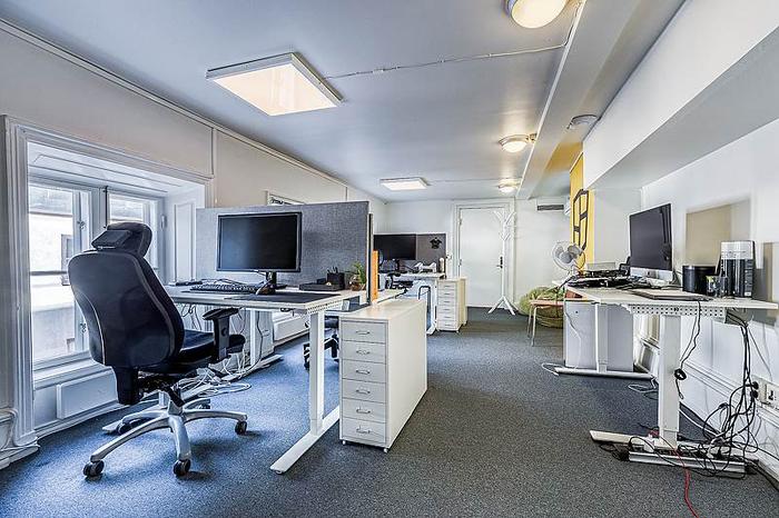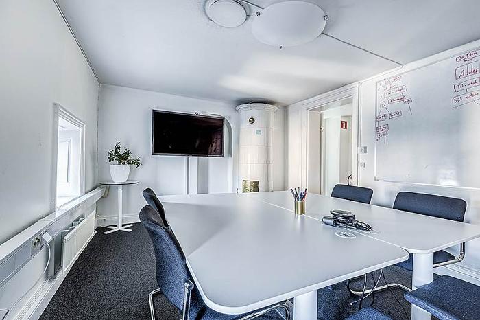 Du möts av en välkomnande öppen entré med plats för väntande besökare och avhängning. Det stora öppna kontorslandskapet rymmer ca 14 arbetsplatser i öppen ytan och här finns även 2 arbetsrum för ca 3 arbetsplatser. Här är det snedtak och generös takhöjd upp till nock. Den övriga rumsfördelningen utgörs av två mötesrum vara det ena med kakelugn med plats för ca 8 respektive ca 6 personer, två stycken 1-persons rum samt ett rymligare rum längst in i lokalen för ca 4-5 arbetsplatser. Det finns också ett loft som nuvarande hyresgäst nyttjat för kreativa aktiviteter. Det moderna, välutrustade pentryt har en vacker kakelugn och matplats för upp till ca 20 personer. Lokalen har även städförråd samt två helkaklade wc med mosaikgolv varav en med dusch.