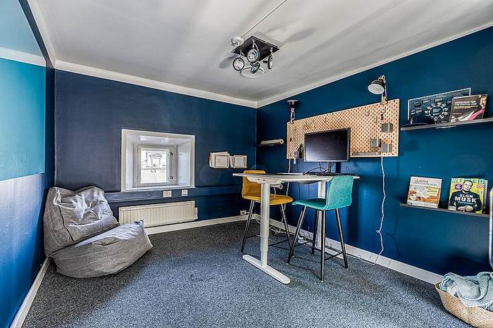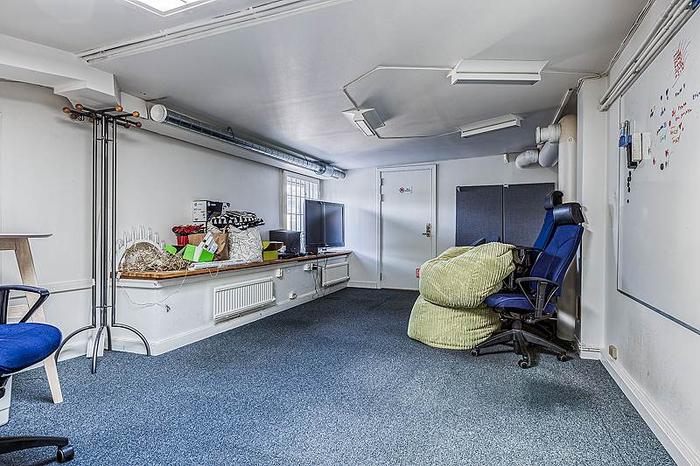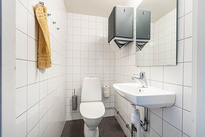 Lokalen är genomgående i mycket fint skick med fräscha ytskikt. De flesta väggarna är vitmålande och arbetsytorna har en grå textilmatta vilket ger en behaglig akustik.