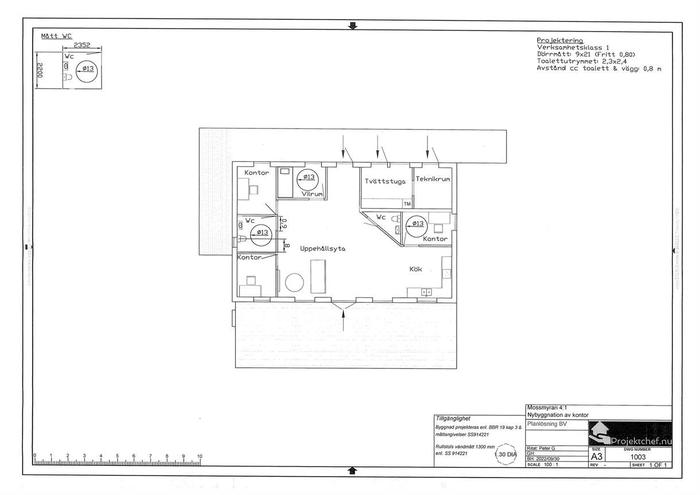 Grund: betongplatta på mark med underliggande isolering och vattenburen golvvärme. Radiatorer på övre plan