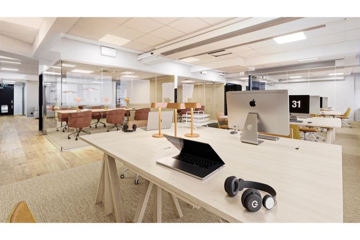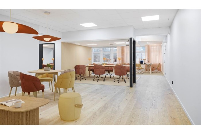 Effektiv planlösning med ett öppet landskap, flertalet glasade mötesrum, dubbla WC samt ett pentry. Möjlighet finns att ta ned mötesrummen om en större öppen planlösning önskas.
