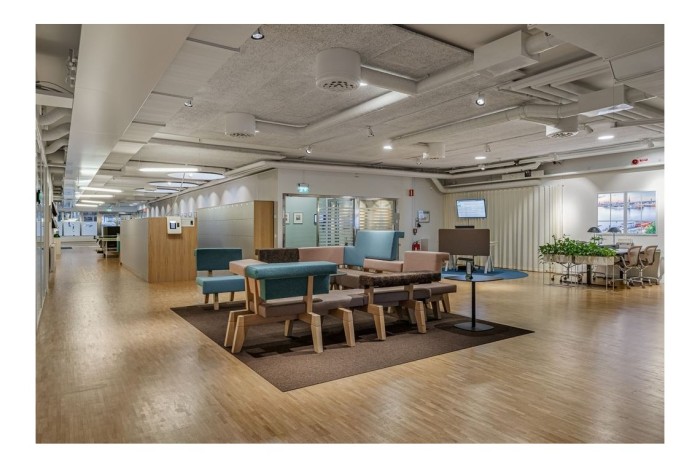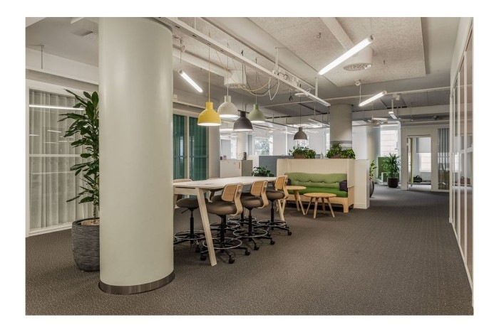 Mycket social yta i form av stort pentry samt loungeytor. Perfekt för att skapa gemenskap på arbetsplatsen. Inom kontoret finns även två omklädningsrum med duschar vilket är tacksamt för cyklister eller de som tar en joggingtur på lunchen. Cykelrum i fastigheten.