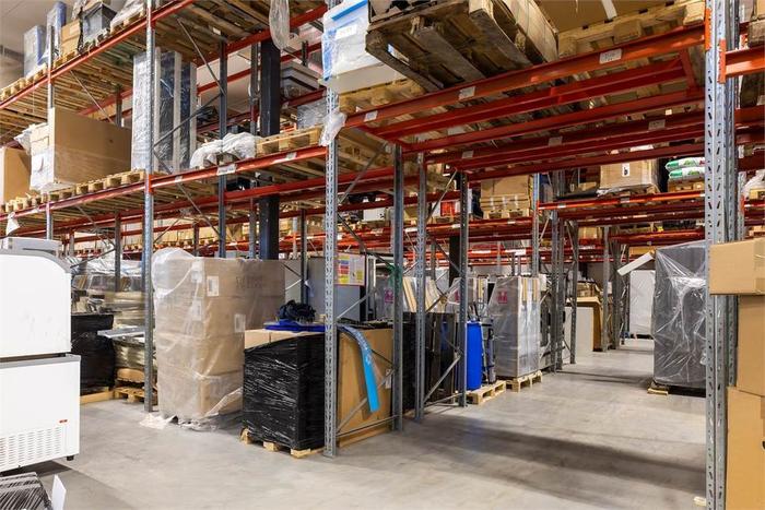 Höglagret har en takhöjd på 7-7,5 m med två elektriska vikportar (höjd 4 m). Lasthiss mellan lagret och övre plan finns.