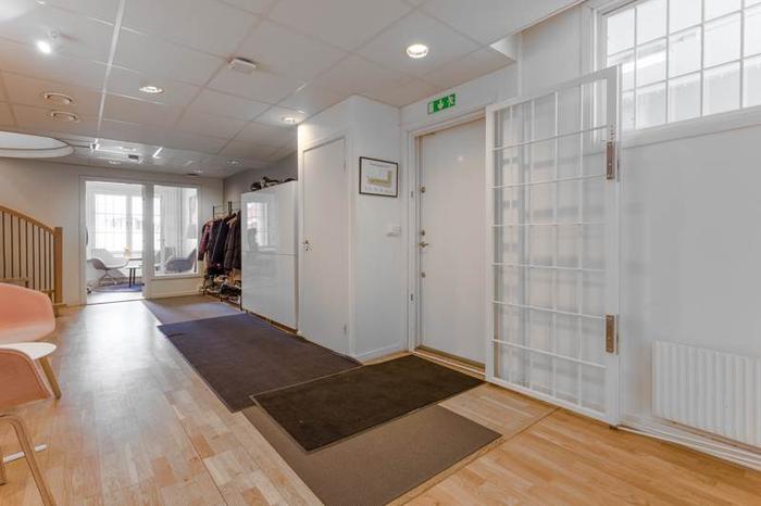 Lokalen har en öppen planlösning och samtliga kvadratmetrar kan nyttjas effektivt. Du möts av en välkomnande entré med plats för avhängning och ett par väntande besökare. Direkt till höger finns ett arbetsrum för ca 3 personer vilket även kan nyttjas som ett extra mötesrum. I nära anslutning till entrén finns två mötesrum samt den rymligare av lokalens två wc med grått klinkergolv och dusch.