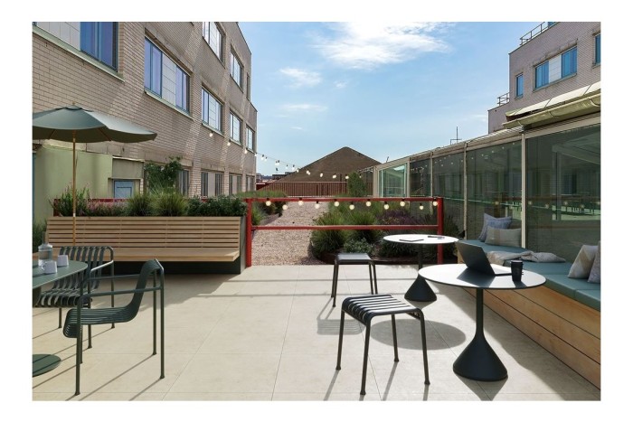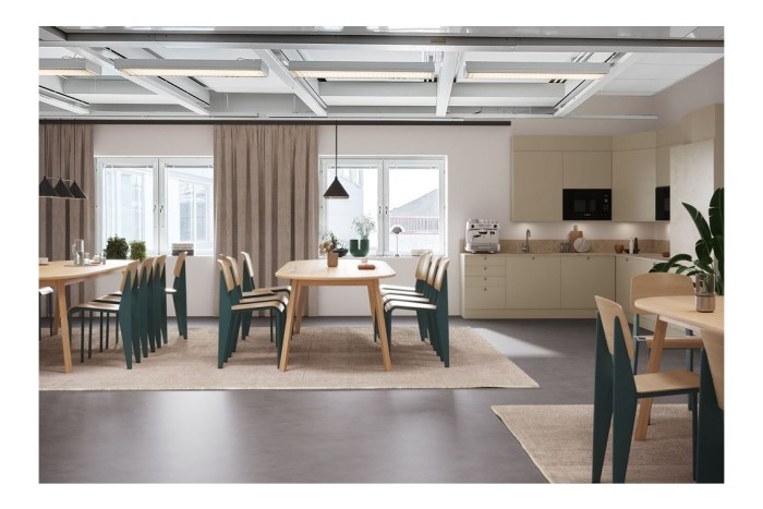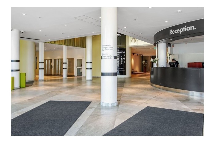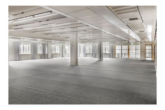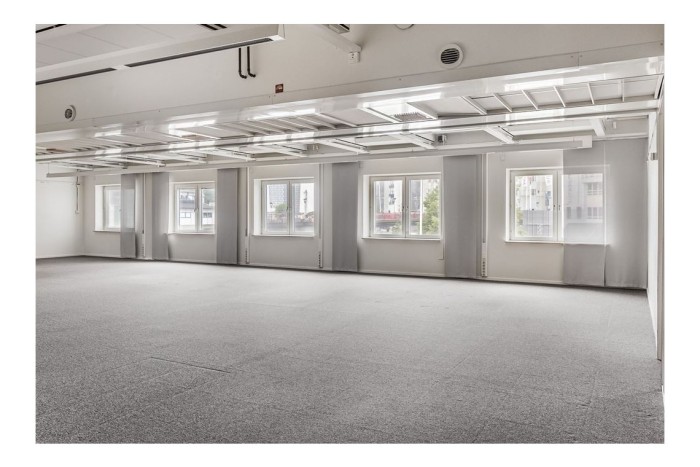 Här erbjuds en modern och yteffektiv lokal, väl lämpad för ett aktivitetsbaserat arbetssätt. Ritningen visar på hur lokalen kan disponeras efter viss ombyggnad. Idag finns en högre grad av egna rum. Tekniskt sett finns det i lokalen möjlighet till ventilation för över 120 personer, vilket möjliggör effektivt nyttjande alternativt utbildningsrum för flertalet personer. Palmfelt center uppfördes 1986- 89 och var ursprungligen hem åt dåvarande Postgirocentralen. Huset har tydliga postmodernistiska drag med lekfulla, geometriska former och detaljer som är typiska för byggnader uppförda under 1980-talet. Den ursprungliga gestaltningen har en hög ambitionsnivå med till exempel högt belägna, planterade gårdar och takterrasser som bryter upp och ger dagsljus till den inre delar av huset. Idag rymmer fastigheten främst kontorsarbetsplatser med en gemensam entré och tillhörande konferenslokaler.