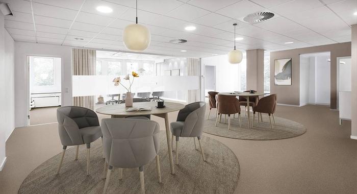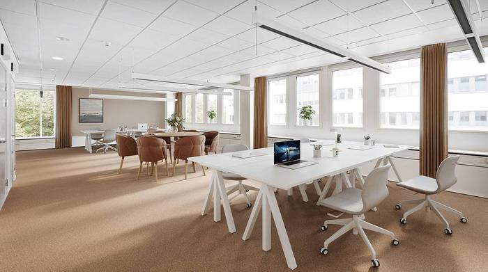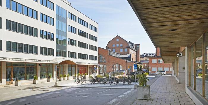 Planlösning:Två våningsplan med kontorsrum, mötesytor, kök och WC. Flexibla arbetsytor med varierade lösningar.