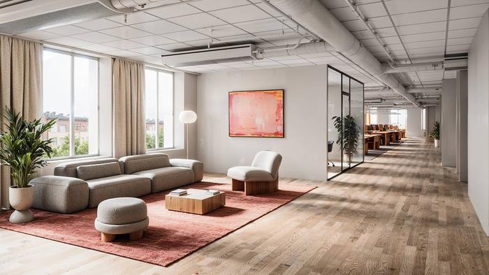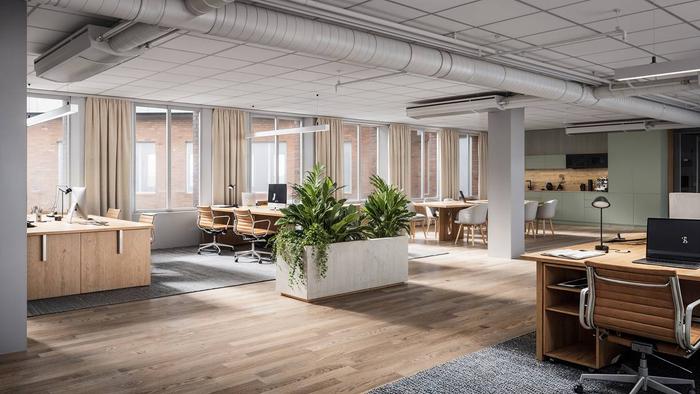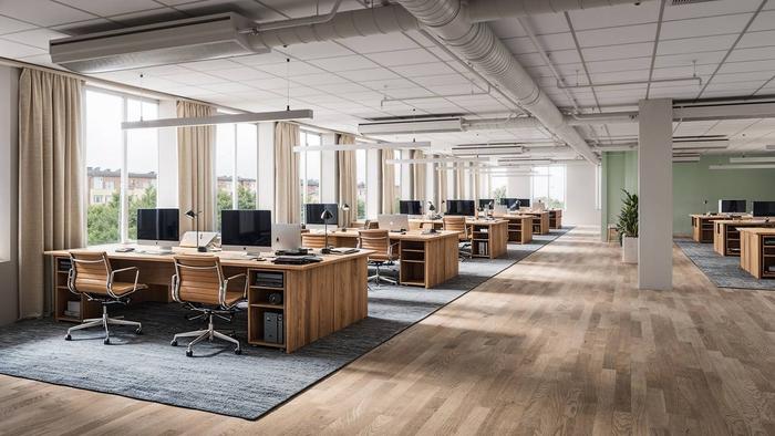 Planlösning:Lokalen har två kontorslandskap, flera mötesrum, lounge, kök och pentry. Två entréer och god cirkulation ger en flexibel arbetsmiljö.