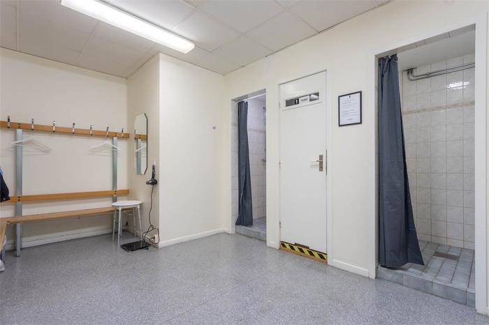 Ett dam och ett herr omklädningsrum med två duschar i vardera