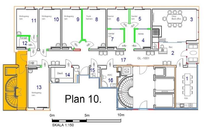Planlösningen är idag rumsindelad och utgörs av 6 stycken mottagningsrum varav alla utom ett har handfat, ett kontorsrum samt ett större rum med öppen spis som förslagsvis kan nyttjas som kontor, personalrum eller ett lyxigt väntrum. Det större rummet har en avskiljande glasvägg med glasdörrar ut mot korridoren. Lokalen har även ett mycket fint och välutrustat pentry med spis/ugn, två inbyggda mikrovågsugnar, pelare med kyl och frys samt fullstor diskmaskin i rostfritt stål. Lokalen har tre exklusivt anpassade wc varav en är rwc och två är utrustade med dusch. Övriga ytor utgörs av omklädningsrum, städförråd och förråd. Korridorsytan kan med fördel nyttjas för väntande patienter så att inte ett mottagningsrum behöver tas i anspråk som väntrum. I den ena änden av korridoren finns en balkong och i den andra änden en fransk balkong.