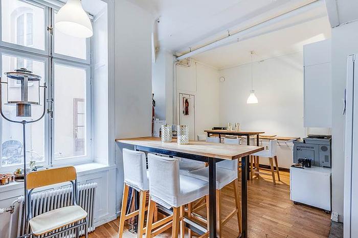 Lokalen har en härlig atmosfär med gammaldag prägel såsom generös takhöjd i rummen, trägolv, vackra fönster och stuckaturer.