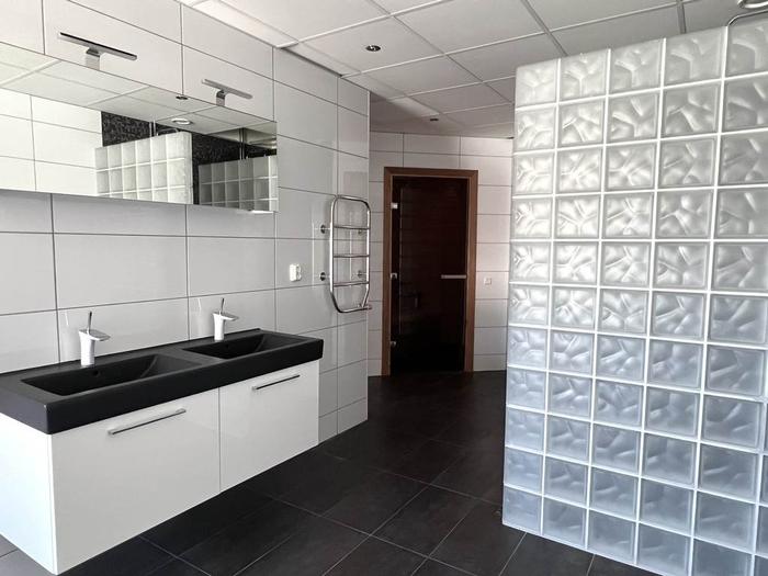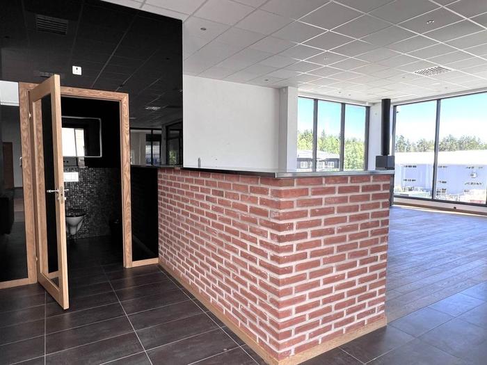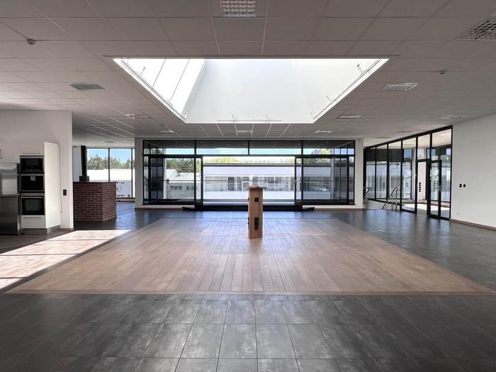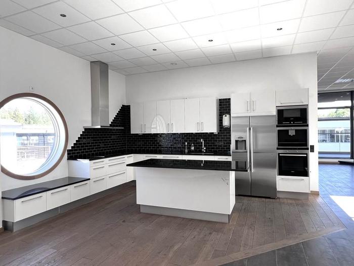Öppen planlösning för kontor och showroom med hög takhöjd, 2 kök, toalett, dusch, bastu och omklädningsutrymme.