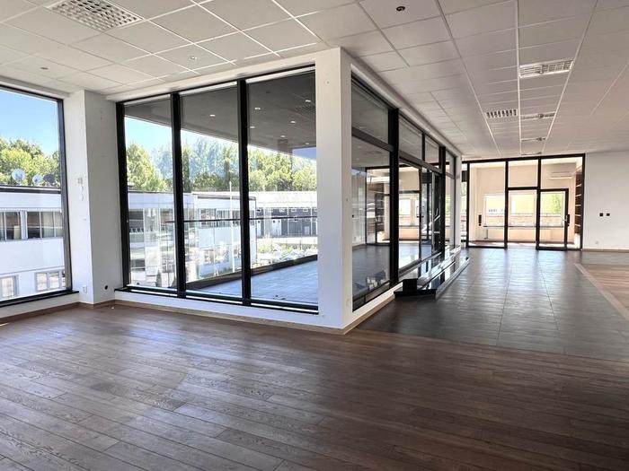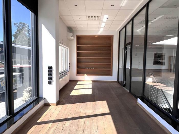 Inglasat kontors- eller konferensrum och stor balkong under tak.