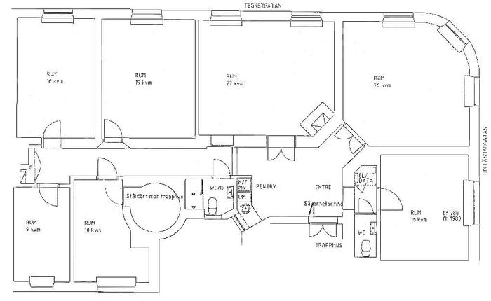 Lokalens planlösning är rumsindelad fördelat på sju rum i varierande storlek varav ett med en vacker öppen spis. Hörnrummet är mycket representativt och det nyttjas idag som konferensrum. Övrig lokalarea fördelas på ett pentry i anslutning till entrén samt två wc varav en med dusch. Om ett rymligare pentry önskas eller en större besöksyta vid entrén så har lokalen på 2 trappor som även finns tillgänglig.