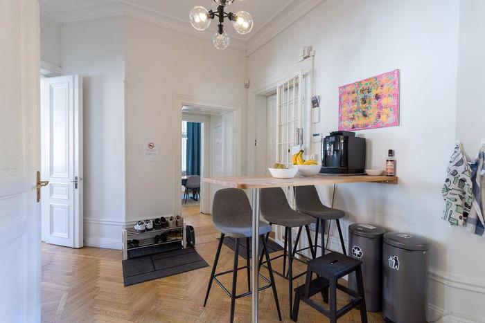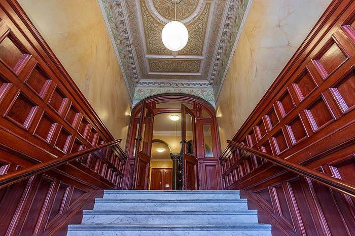 Lokalen erbjuder en härlig atmosfär med bevarade snickerier från byggnadsåren så som stuckaturer, takrosetter, spegeldörrar samt vackra högresta fönster.
