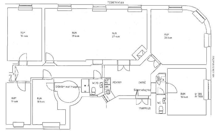 Lokalens planlösning är rumsindelad och fördelas på fem rum i varierande storlek varav ett med en vacker öppen spis. Hörnrummet är mycket representativt och det nyttjas idag som konferensrum. Det största rummet är två rum som har slagits ihop. Övrig lokalarea fördelas på ett pentry i anslutning till entrén samt två fräscha helkaklade wc. Om ett rymligare pentry önskas eller en större besöksyta vid entrén så har lokalen på 2 trappor som även finns tillgänglig den planlösningen.