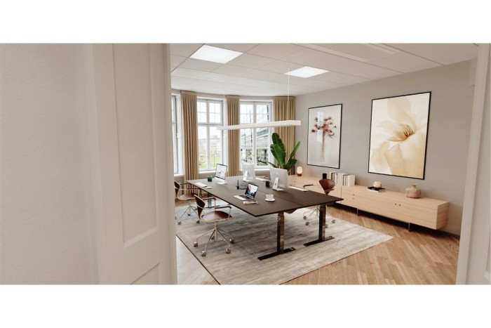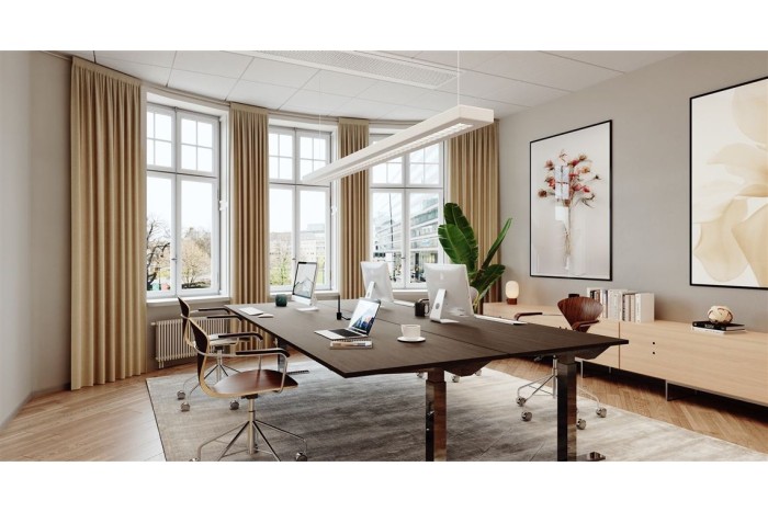 Trevlig kontorslokal i bra läge med större kontorsrum och mötesrum i lokalen, 3 st toaletter varav 1 med dusch. Stora fönster och högt i tak med utsikt över parken. Ritning visar nuvarande planlösning. Visionsbilderna i annonsen visar på hur kontoret kan se ut efter renovering.