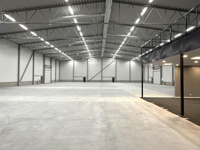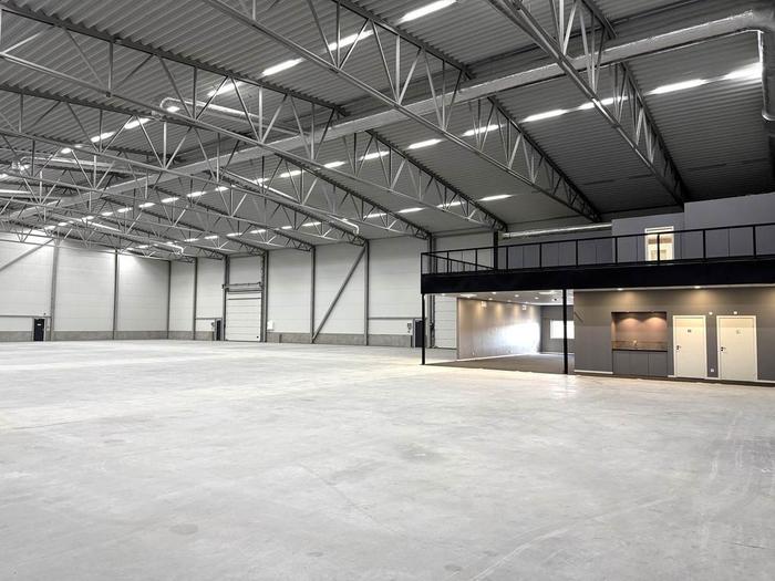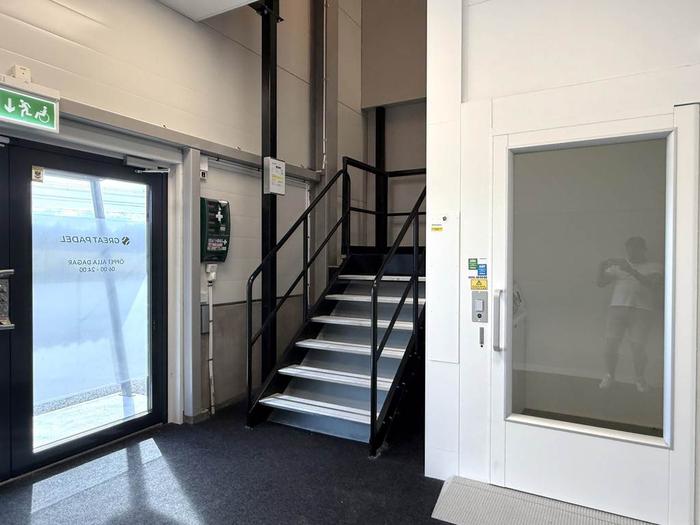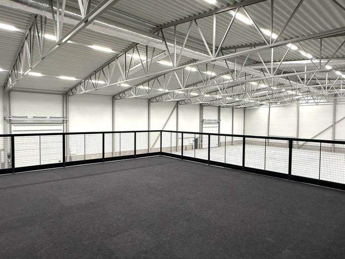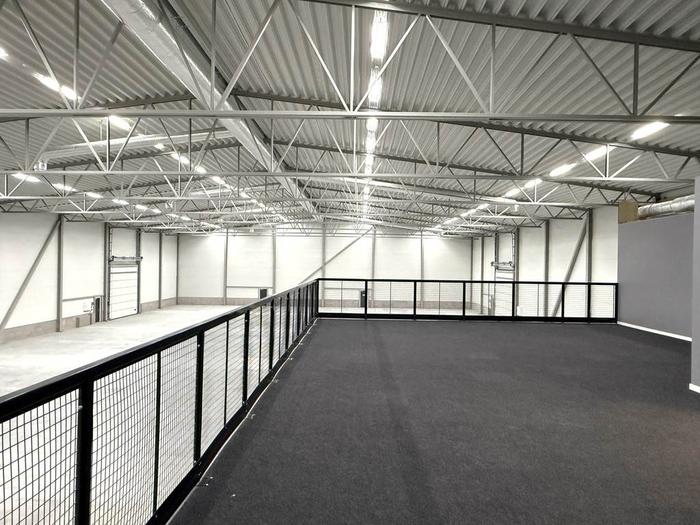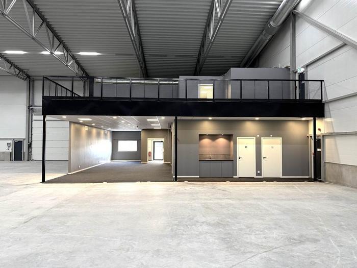 Entresolplan (3,0 kN/m²) med hiss, perfekt för extra lager, kontor eller aktivitetsyta.