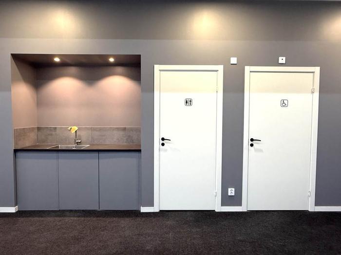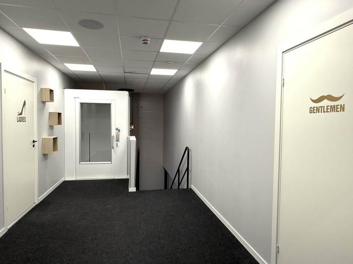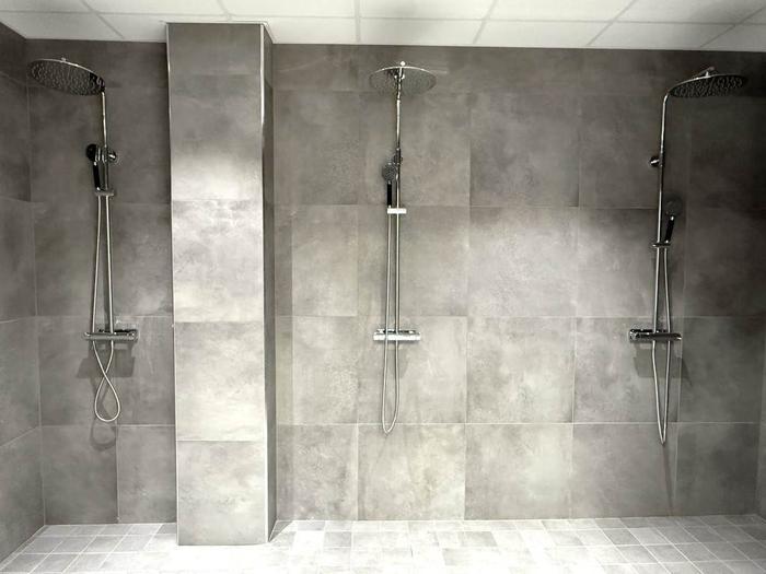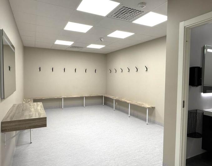 Moderna personalutrymmen: två stora omklädningsrum med duschar, kök/pentry, WC (inkl. handikappanpassad).