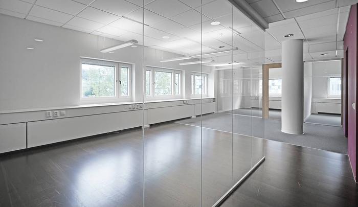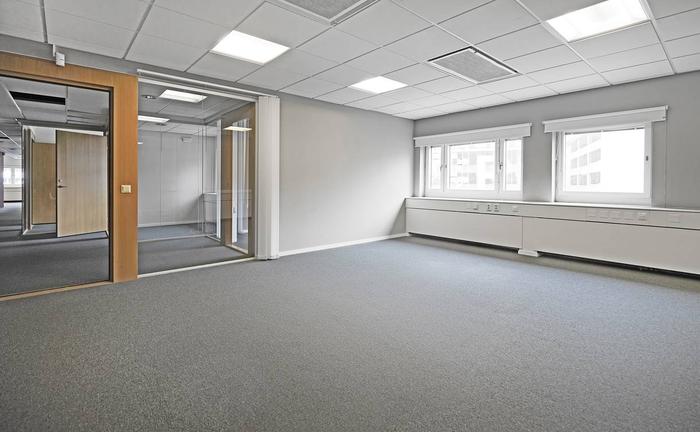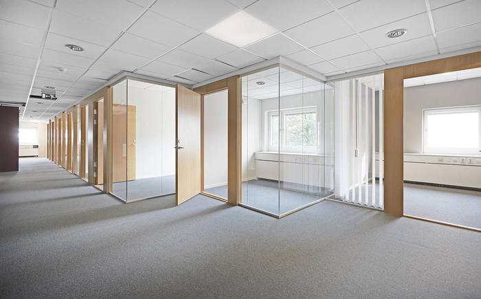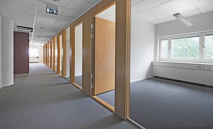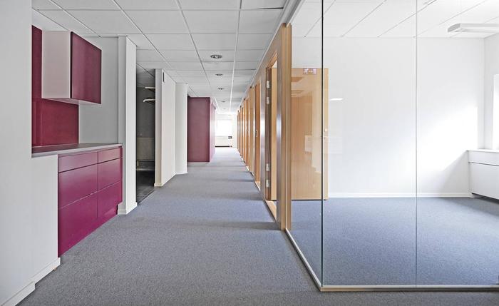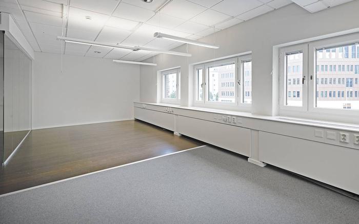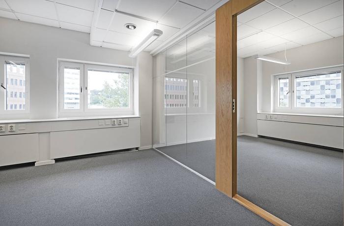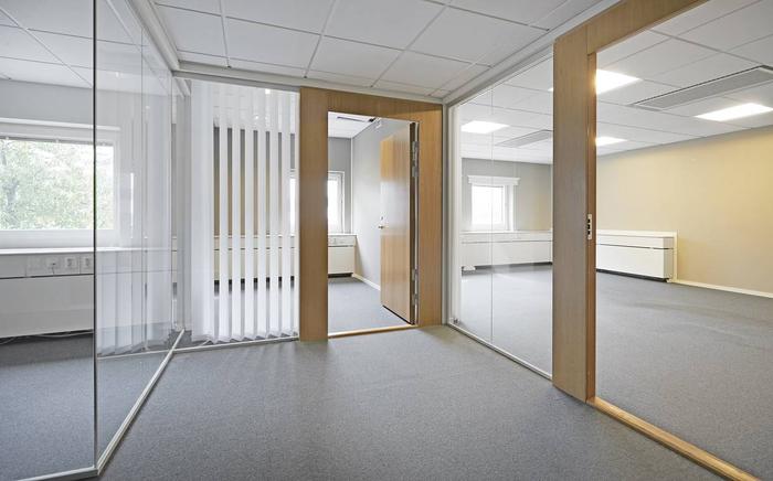 Trivsam och ljus lokal med vita väggar och ett genomgående textilmatta på golv. I lokalen finns flertalet arbetsrum, konferensrum samt...