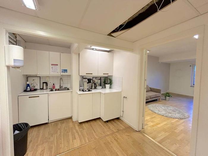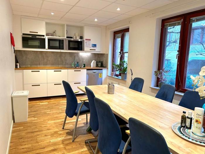 Det stora, fullt utrustade köket fungerar som en naturlig samlingspunkt för luncher och fikastunder, och det finns dessutom ett extra pentry samt flera wc för att underlätta vardagen. Ljusa ytor och en rymlig planlösning skapar en inbjudande miljö för både medarbetare och besökare.