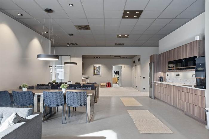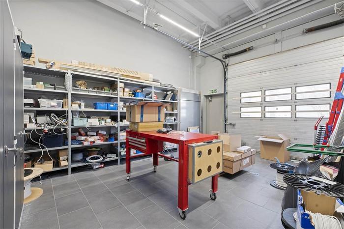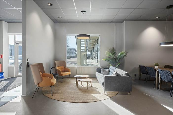 Invändigt finner vi olika typer av lokaler för olika behov. På entréplan finns tre lokaler med rikligt ljusinsläpp via stora glaspartier mot gården. Detta i kombination med den höga takhöjden på ca 4 m upp till bjälklag, ger en öppen och rymlig atmosfär som lämpar sig för många olika verksamheter. Lokalerna nås enkelt för inlastning med bil via en genomfart på husets västra sida.
