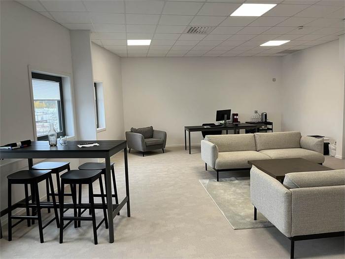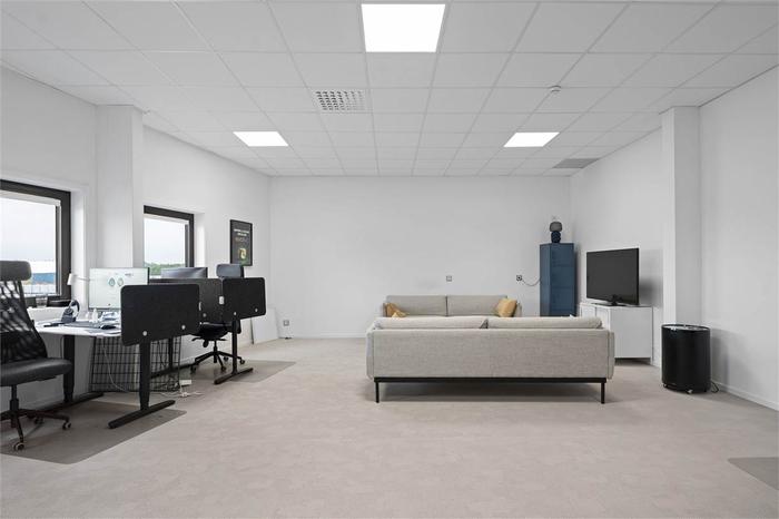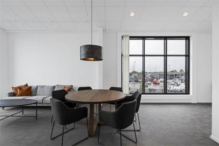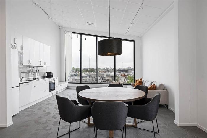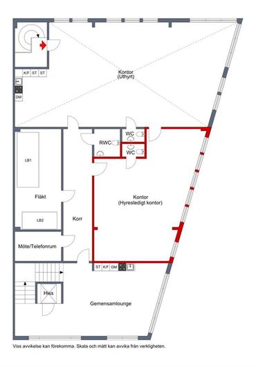 Du når det här moderna och fina kontoret via ett vältilltaget och fint trapphus, det finns även en hiss. Från trapphuset kommer du direkt in till det gemensamma köket. Köket är fullt utrustat med bl.a. induktionshäll och diskmakskin, här finns även en stor matgrupp och soffgrupp. Vidare finns ett gemensamt konferensrum som rymmer plats för 4-6 personer, konferensrummet är även inrett med tv. Vidare nås kontorslokalen om totalt 70 kvm + 40 kvm. Kontorslokalen är öppen och ljust tack vare den öppna planlösningen och det väl tilltagna fönsterpartierna. Här får det plats mellan 8-10 kontorsplatser, det finns även utrymme för en personalavdelning med soffgrupper eller liknande. Det finns även en egen WC som tillhör lokalen.