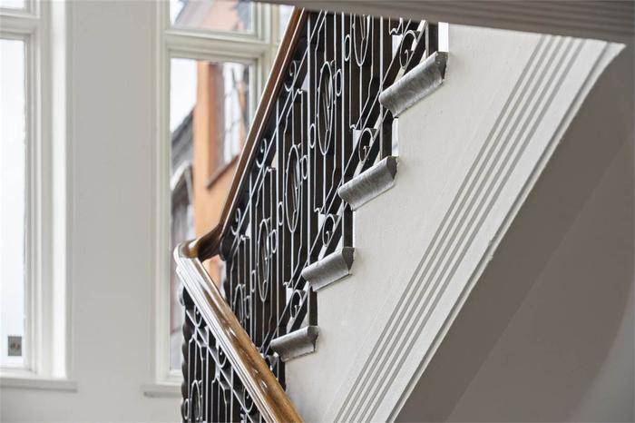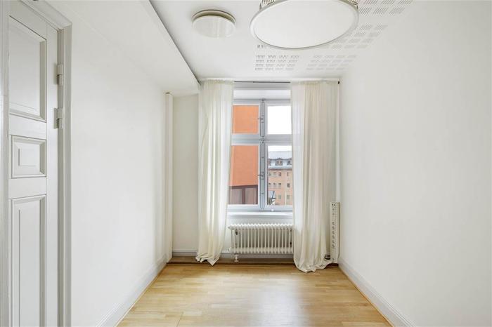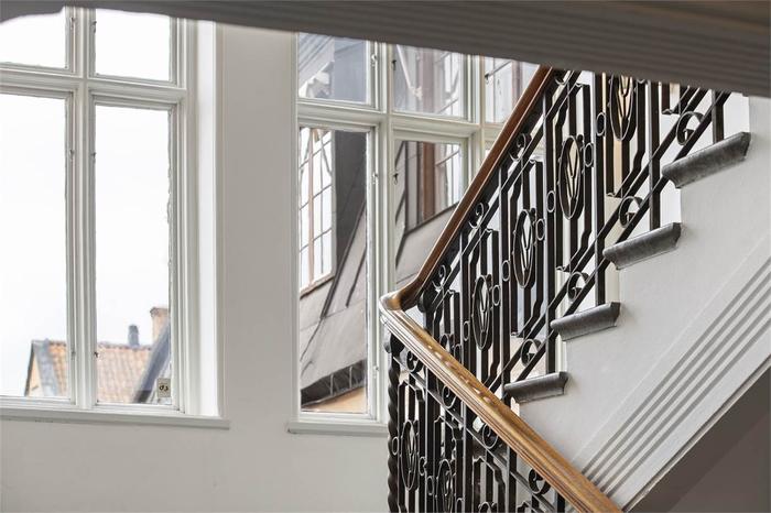 Kontoret om totalt 400 kvm är rumsindelat med rum i varierande storlek som gör att man kan sitta i ett eget kontor eller dela rum med en eller flera i vissa rum. De större rummen kan ju även brukas som konferensrum. Längre in i kontoret i mitten av lokalen finns en stor social yta med en välutrustad köksdel. Här finns plats för flera matbord, soffgrupp för personalen att umgås på .Det finns kapprum och tre toaletter vid entrén. Från kontoret är det en magisk utsikt mot Uppsalas anrika kvarter. Kontoret har genomgående ljusa ytskikt med vackra trägolv.