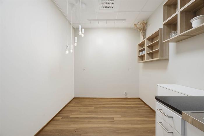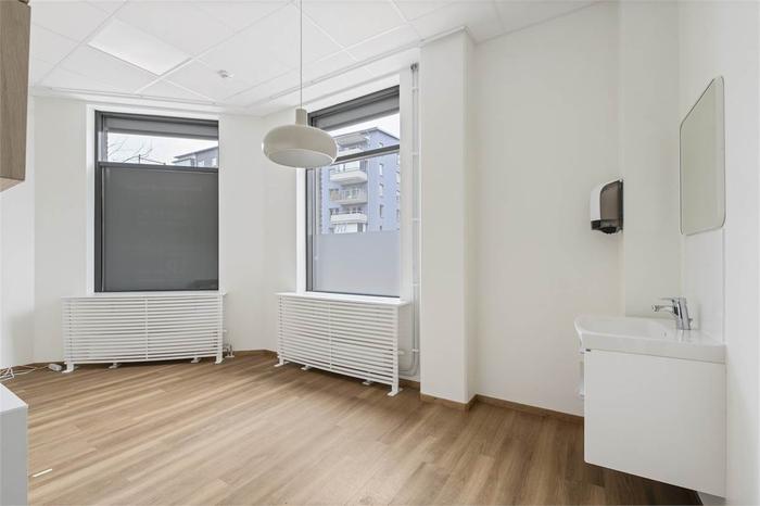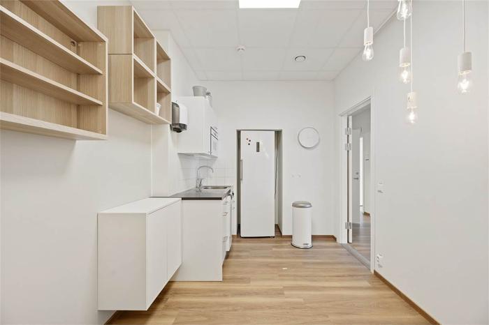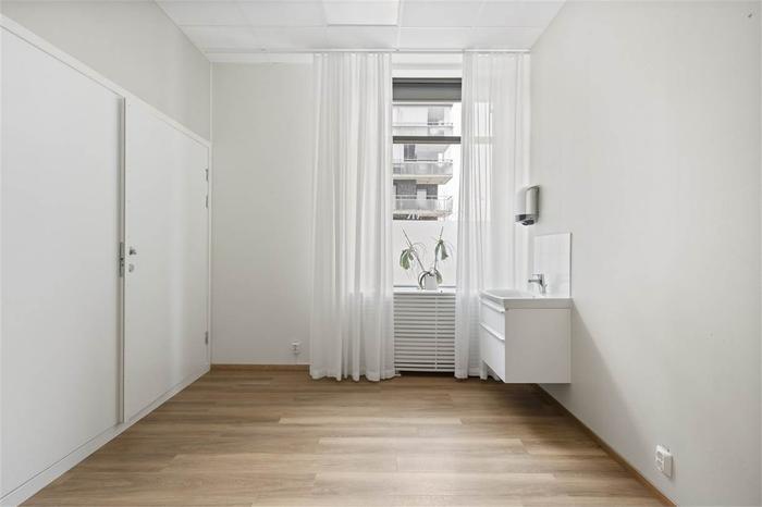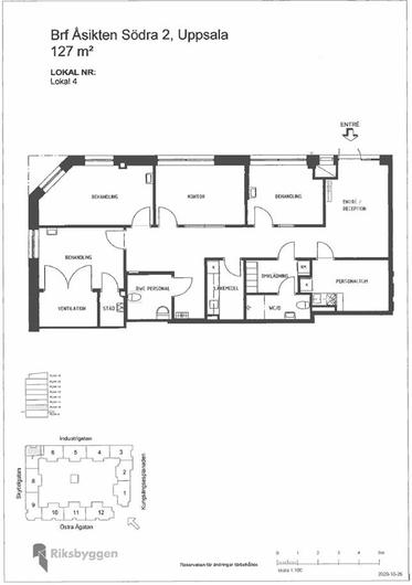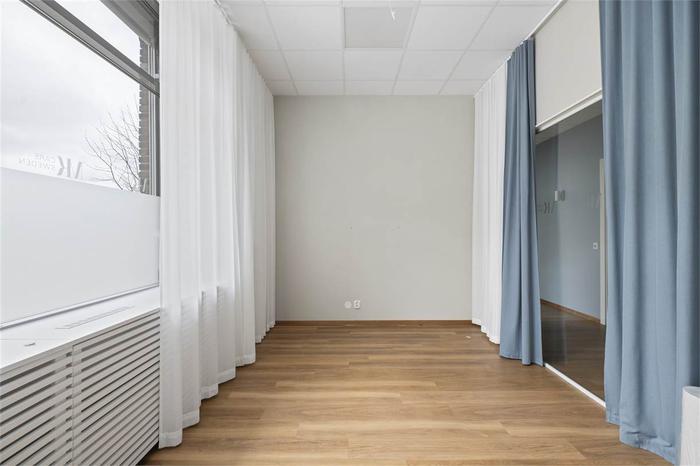 Rymlig hörnlokal om totalt 127 kvm. När du kliver in i lokalen möts man av en rymlig entré med plats för reception och avhängning. Vidare in i lokalen finns det 4 separata behandlingsrum, samtliga behandlingsrum har vatten och avlopp framdraget och installerat. Till behandlingsrummen finns det ett separat pentry tillämpat för medicin hantering. Det finns även ett rymligt personalrum med pentry, omklädningsrum med tvättmaskin, personal toalett med dusch, kund toalett samt ett förråd. Samtliga ytskikt är fräscha med ljusmålade väggar och parkettgolv.