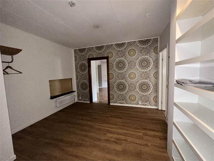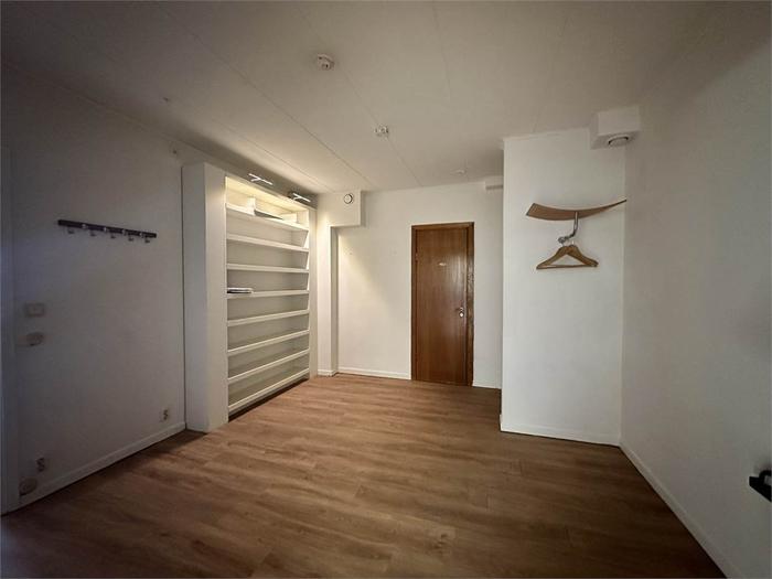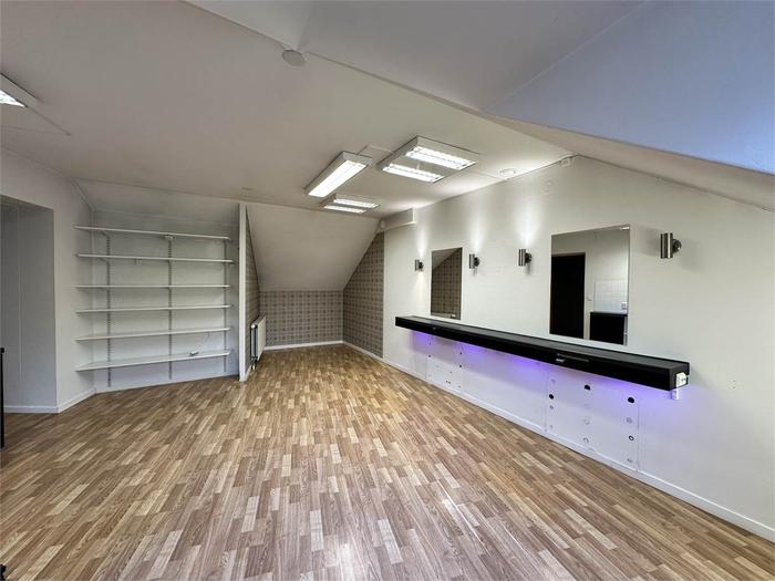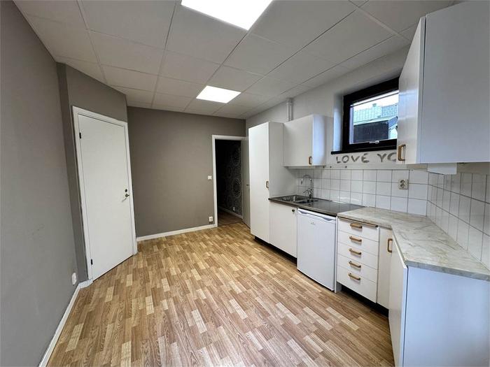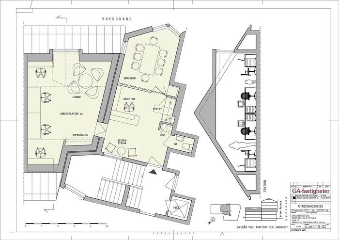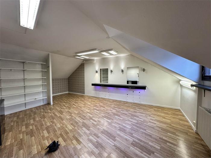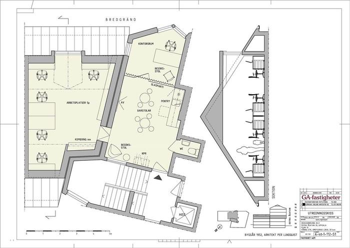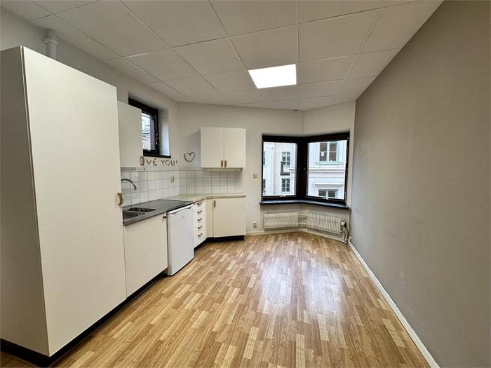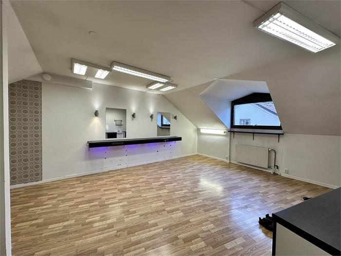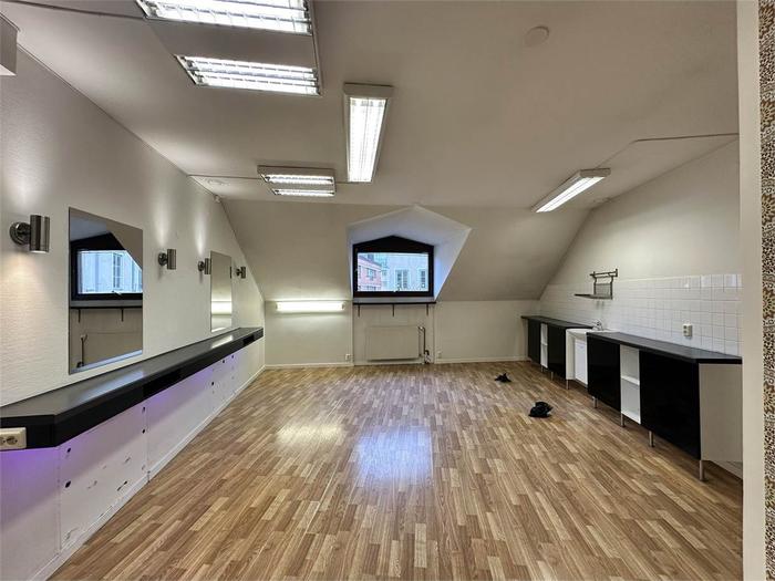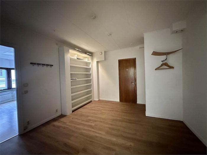 Lokalen om 59 kvm har en hall med WC och plats för loungemöbel. Längre in finns ett rum med pentry och plats för matbord. soffgrupp. Till vänster i hallen finns ett större rum, perfekt för ett kontorslandskap med fönster ut mot Bredgränd.